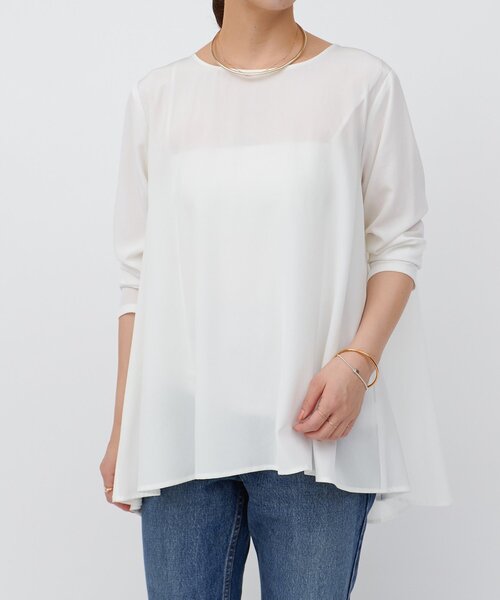 ■アイテムシンプルながら後ろフレアのシルエットがサマになるブラウス。上品な大人のシアー感があり、カットソー感覚で着られますが、ロンTよりも洗練された着こなしに。身頃部分はゆとりのあるサイジングと長めの着丈で、身体のラインを拾いすぎないのもポイント。ボトムのシルエットを選ばず、デニムで普段使い、タックパンツでお仕事用などON/OFF問わずにお召いただけます。1枚でさらりと着こなすのはもちろん、ジャケットやカーディガンのインナーとしても重宝しそうです。■素材・洗濯表示素材:トリアセテート57% ポリエステル43%洗濯表示:手洗い可※着用時・洗濯時は、必ず取扱い表示・タグをご確認の上、お取り扱い下さい。----------------------------------伸縮性:ややあり光沢:あり厚み:うすい透け感:あり裏地:なし----------------------------------《LIVETRT/リヴェタート》BEARDSLEYのインブランドLIVETART(リヴェタート)美しい刺繍やレース、しなやかなフォルム、鮮やかな色彩、大胆なプリント。アートに触れるような心地よい緊張感であらたまった場所へも気負いなく身につけられる。日常と非日常をつなぐ、いつもより少し高揚感に包まれる服。《お取り扱い上のご注意》・タンブル乾燥不可《予約商品について》・サンプルの為、素材情報、洗濯表示については企画段階の情報を記載しております。公的機関での試験データ結果を受け、量産にあたり混率や洗濯方法の変更が発生する場合がございますので、ご了承くださいませ。・サンプルでの撮影、計測をしております。商品の仕様が一部変更になる場合がございます。・撮影サンプル品はブランドタグがついておりません。製品にはタグがつきますので、製品の表に縫い糸が見える場合がございます。・工場の生産の都合上、納期が変更になる場合がございます。検品や輸送の関係で、発送日が前後しますのでご了承ください。また、入荷状況により、お客様への発送が店頭販売より遅れる場合もございます。・店頭に陳列していた商品も含まれる場合がございます。《商品画像について》ご覧頂いている商品の写真につきましては、できるだけ実物の色に近くなるように努めておりますが お使いの環境(モニター、ブラウザ等)の違いにより、色の見え方が実物と若干異なる場合がございます。 予めご了承ください。《ハートをタップして商品のお気に入り登録》【ハートをタップ】登録カラーの商品の「残りわずか」「再入荷」「値下げ」通知を受け取ることができます。【各ショップアプリにてブランドフォロー】 新商品などの入荷情報、最新のニュースやお得な情報を受け取ることができます。