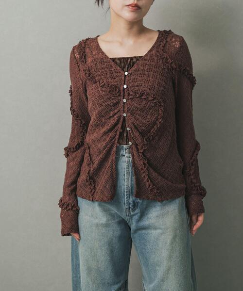 【繊細なレースで魅せる。華やかVネックカーディガン】・伸縮性のあるレース素材で快適な着心地・繊細なレースのラインとフリルが女性らしさを演出・フロントの小さなボタンが上品なアクセント軽やかなレース素材に、フリルやギャザーが施されたVネックカーディガン。着るだけで、いつものスタイルがぐっと華やかな印象に変わります。【2025 Autumn/Winter】【25AW】※この商品は、素材の特性上、洗濯の際に多少の縮みが生じる恐れがあります。ご了承ください。※この素材は、摩擦や汗・雨に濡れた状態での使用により、他の衣料等に色が移る場合がございますので、充分にご注意ください。※その他お取り扱いに関しましては、商品に付属のアテンションタグをご覧ください。総重量 : 約190g※商品画像は、光の当たり具合やパソコンなどの閲覧環境により、実際の色味と異なって見える場合がございます。予めご了承ください。※商品の色味の目安は、商品単体の画像をご参照ください。▼お気に入り登録のおすすめ▼お気に入り登録商品は、マイページにて現在の価格情報や在庫状況の確認が可能です。 お買い物リストの管理に是非ご利用下さい。素材感透け感 : あり伸縮性 : ややあり裏地 : なし光沢 : なしポケット : なしone