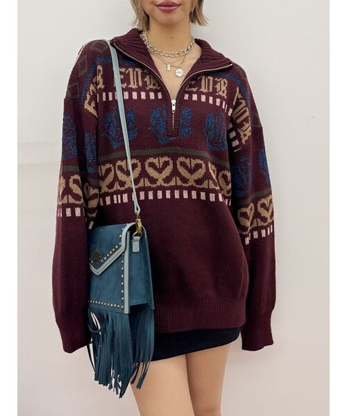 モールヤーンとモヘアタッチ素材を組み合わせた、存在感抜群のジャガードニット。EVRIS(エヴリス)らしいオリジナルのグラフィックパターンが印象的で、コーディネートの主軸になる1着です。ゆったりとしたシルエットにハーフジップを加え、抜け感と着まわしやすさを両立。長めの着丈で、ボトムを選ばずワンピース風の着こなしも可能です。