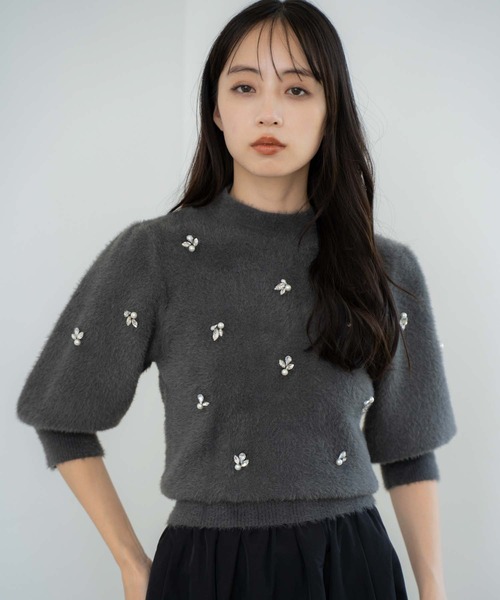 ふわふわのシャギーニットにビジューをあしらった華やかな1着。毛足がありながらも、コンパクトなシルエットでバランスよく着こなせます。ギャザーボリュームスカートとのコーディネートがおすすめです。ブラックが販路限定カラーです。(販売店舗:WEB ※天王寺ミオ店での販売は終了しました)■商品特徴裏地:なし生地の厚さ:普通透け感:なし伸縮性:ありポケット:なしファスナー:なし※不良品や配送不備以外での返品・交換はお受けいたしかねます。あらかじめご了承ください。※掲載商品はサンプルのため、実際の商品とは色味・仕様・加工・サイズ等が若干異なる場合がございます。あらかじめご了承ください。※商品の詳細な色味・仕様につきましては、商品単体のトルソー画像をご参照ください。※撮影時の照明やご利用のパソコン・スマートフォンの設定により、実際の色味と異なって見える場合がございます。あらかじめご了承ください。■スタッフ着用レビュースタッフE/160cm/骨格:ストレート/着用サイズ:M【サイズ感】:首まわり袖回りも余裕があり、ノンストレスで着用できます。【着用感】:シャギーなので肌が敏感な方にも安心して着用いただけます。5分袖なのも秋に嬉しいです。【おすすめポイント】:目を惹くビジューがポイントです。手持ちのベーシックボトムと合わせるだけでコーディネートをアップデートできます。ブラックは販路限定なので、特におすすめです。スタッフT/165cm/骨格:ナチュラル/着用サイズ:M【サイズ感】:袖周りはフィットしますが、身幅はやや余裕あります。【着用感】:ふわふわで柔らかく、着心地がいいです。裾はリブでキュッとしているので、ボトムスにインしてもアウトで着てもバランスが取りやすいです。【おすすめポイント】:ビジューがとってもゴージャスで、コーデの主役になってくれる一枚。パフスリーブは二の腕をカバーしつつ可愛らしい印象もプラスしてくれます。