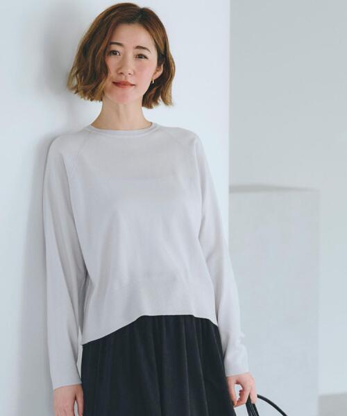 シリーズ累計販売枚数35万枚突破!! 大人気の毛玉軽減ニットシリーズ NEWデザインが登場 重ね着も一枚着も、すっきり映えるニット 【デザイン】 ラグランスリーブと脇に入れたデザインラインが、シンプルな中にさりげないアクセントを加えたニットです。 ゆったりとしたオーバーサイズでリラックスした着心地。 天竺編みで、オーバーサイズながら体に馴染んでやわらかな印象に仕上がっています。 ネックラインは細めのリブで、顔まわりに軽さを添えました。 やや後ろ下がりの着丈で、裾からインナーを見せるレイヤードも楽しめるストレートシルエットに仕上げています。 【素材】 特殊な原料を混紡した毛玉になりにくい糸を使用しています。 ふくらみを持たせながらも滑らかな風合いが特徴。 ご自宅で洗濯機洗いもでき、お手入れも手軽で長く愛用いただける特別なニットです。 【スタイリング】 シャツやカットソーとのレイヤードスタイルはもちろん、ワイドパンツやスカートと合わせてすっきり見せるのもおすすめです。 季節の変わり目にも重宝する一枚です。 ※照明の関係により、実際よりも色味が違って見える場合があります。また、パソコン・スマートフォンなどの環境により、若干製品と画像のカラーが異なる場合もございます。 【25AW】 モデル情報:身長166cm B80 W59 H86 着用サイズ:02(M) 店舗へのお問い合わせ商品番号:768-14003 ●製品寸法: 01(S):着丈51cm B102cm 裄丈73cm 02(M):着丈53cm B106cm 裄丈75cm 03(L):着丈55cm B110cm 裄丈78cm 04(LL):着丈57cm B114cm 裄丈80cm 05(3L):着丈59cm B118cm 裄丈83cm 備考: