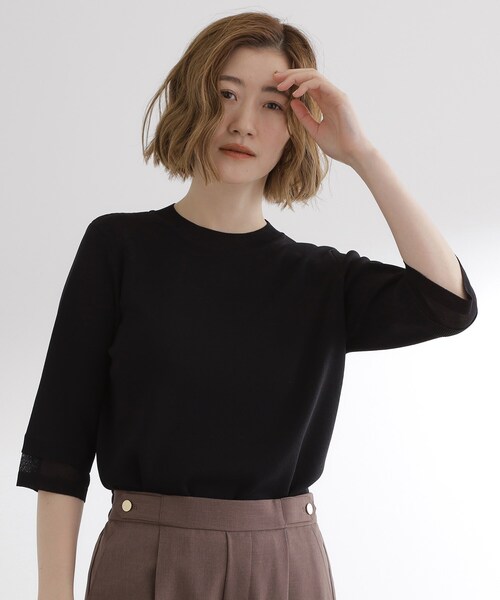 人気シリーズ!気取らず着られてキレイが叶う やわらかドライタッチニットにNEWデザインが登場【デザイン】groveで定番人気のやわらかドライタッチニットに新しいデザインが登場。袖口にラメシアーのニットをドッキングし、シンプルながら洒落感ある1枚に。二の腕から肘がしっかり隠れてロングシーズン活躍する袖丈も魅力。※生産工程の都合上、袖の切り換え部分の幅に個体差(ブラックはやや短め、その他カラーはやや長め)が生じる場合がありますが、袖全体の着用感に影響はありません。裾はアウトで着用してもすっきりとするストレートシルエットに。身幅が大きすぎないので、ボトムスインもしやすいサイジングです。衿ぐりはややコンパクトめなクルーネックに。秋のムードを先取りできるバランスです。【素材】レーヨンの落ち感と発色性の良さが特徴。総針仕立てでしっかりした肉感です。ソフトな仕上げなのにドライタッチ感もあり、ひんやりした心地の良いニットです。◆接触冷感◆UVカット◆毛玉になりにくい4つの機能がついています。【スタイリング】どんなボトムとも相性のいいニットです。ボトムやシューズ・小物次第でカジュアルにもキレイメにも着こなせるデザインです。※この製品は、太陽光線中の紫外線(UV)を通しにくくします。この効果は永久的ではありません。※照明の関係により、実際よりも色味が違って見える場合があります。また、パソコン・スマートフォンなどの環境により、若干製品と画像のカラーが異なる場合もございます。【25AW】モデル情報:身長166cm B80 W59 H86 着用サイズ:02(M)店舗へのお問い合わせ商品番号:768-14004●製品寸法:01(S):着丈54cm B87cm 袖丈34cm 肩幅31cm02(M):着丈56cm B91cm 袖丈35cm 肩幅33cm03(L):着丈58cm B95cm 袖丈36cm 肩幅35cm04(LL):着丈60cm B99cm 袖丈37cm 肩幅37cm05(3L):着丈62cm B103cm 袖丈38cm 肩幅39cm備考: