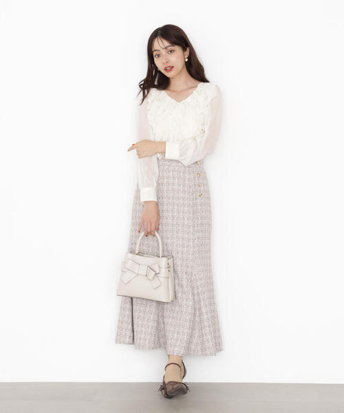 <petit size>通常のSサイズやMサイズから着丈などの長さを短くリサイズし、152cm Aroundの小柄さんにもバランスよく着用いただけるサイズに仕上げています。ZOZO・official site・店舗のみの限定展開です。PS(商品によってはPM/PXSの展開あり)でのサイズ表記になっています。ラメツイード生地を使用したマーメイドスカートです。裾に向かってふんだんに広がるマーメイドシルエットが女性らしいデザイン。ゴールドカラーの釦をアクセントに、トップスの裾をINする着こなしがおすすめ。同シリーズのブルゾンを合わせ、セットアップとしても着ていただけます。<素材>ラメツイード素材を使用しています。<詳細>仕様・後ろファスナー裏地・あり透け感・なし / 光沢・ややあり / 伸縮性・なし生地の厚さ・厚手<シリーズ>■ブルゾン[品番:1215255915]■タイトスカート[品番:1215220915]※モデルの着用画像の場合、光の当たり具合により、実際の色味と異なって見えることがございます。色味は、商品単体の画像をご参照ください。<商品のお気に入り登録>お気に入りアイテムの値下げ・再入荷・在庫1点などの通知を受け取ることができる便利機能ですので気に入ったアイテムはお気に入り登録がおすすめ!<ショップのお気に入り登録>新商品や再入荷、セール、クーポン配布などお得な情報を受け取ることができます。●撮影はサンプル商品で行っている為、仕様とサイズが異なる場合がございます。●スタジオ及び屋外で撮影した着用画像は、光の当たり具合で色味が違って見える場合があります。予めご了承ください。