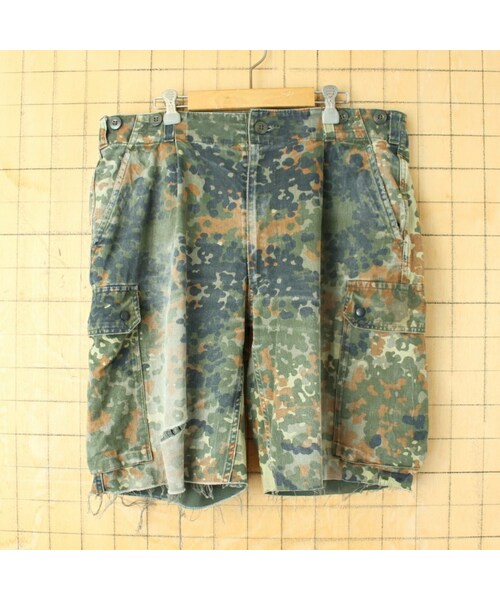ドイツ軍 ミリタリー フレクターカモ カットオフ カーゴショートパンツ W36相当 タック 迷彩 カモフラージュ 実品 ヨーロッパ古着です。 ドイツ軍のミリタリー迷彩カーゴショーツです。 ブラウンやグリーンをベースにしたカモ柄、程よい厚みのあるしっかりとした生地感です。 ウエストポケットが2つ、カーゴポケット2つ、バックポケット1つあります。 サスペンダーボタンが取り付けられています。 タウンユース、アウトドアなどに最適なアイテム。 サイズはW36相当です。 詳細サイズにてご確認ください。 当店にてクリーニング済みです。 右足に擦り切れがあります。 詳細画像にてご確認ください。 【表記サイズ】 18 【素材】 コットン 80% ポリエステル 20% 【採寸サイズ】 ウエスト:92cm 股上:31.5cm 股下:24cm すそ幅:32cm もも幅:36cm ヒップ:120cm