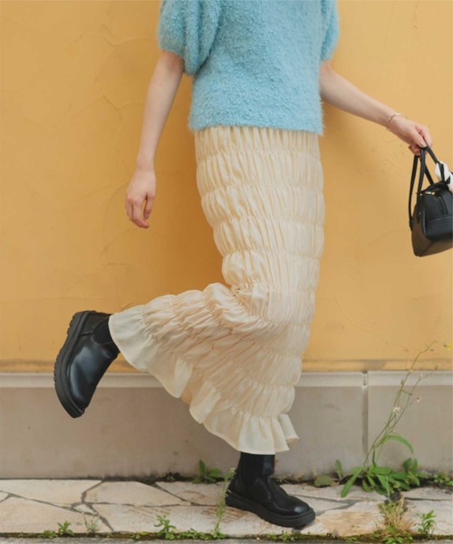 表情のあるシャーリングデザインが魅力のIラインスカート。シンプルながら存在感のあるシルエットで、女性らしさを引き立てる一枚です。■Point・シャーリングがアクセント:動きのある立体感で、シンプルなトップスとも好相性。・フィットしすぎないIライン:程よく身体に沿うシルエットで、スタイルアップも叶います。・裏地付きで安心感:透け感を気にせず快適に着用できます。・ウエストオールゴム仕様:脱ぎ着がラクで、リラックス感のある履き心地。■Coordinate・デイリーカジュアルに:無地のロンTやスウェットを合わせてラフに着こなすだけでおしゃれに。・キレイめコーデにも:ブラウスやリブニットと合わせて女性らしい着こなしに仕上がります。・季節問わず活躍:サンダルやスニーカーでカジュアルに、ブーツと合わせて秋冬スタイルにも◎1枚で華やかさと上品さを演出できるシャーリングスカートは、デイリーにも特別な日にも活躍します。※当商品は機械による生産の過程上、どうしても"生地を織る際の糸の継ぎ目"や多少の"ほつれ"、他繊維の"混紡"、また、形やサイズや柄に多少の"誤差"が生じる場合がございます。※サイズは、実寸サイズを測っているため多少誤差がでる場合があります。製造工程の関係上、各採寸箇所実寸(平置き)より【約-3cm~+3cm】程度は誤差の許容範囲とさせて頂いておりますので、予めご了承くださいませ。※メーカーより密封状態で入庫し、検品時に再度袋詰めを行っておりますが、素材により染料等の臭いが強い場合がございます。※発送上の状態によって商品がシワになる場合がございます。※商品により色落ち・色移りがある場合がございますので、品質表示をご確認の上、お取り扱いにご注意くださいませ。【伸縮性】加工によりあり【透け感】淡色に多少あり