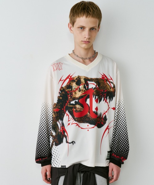 【AIVER レックスジャージプルオーバー】 ・秋冬仕様で厚みのある生地を採用・さらさらとした滑らかな質感のポリエステル素材 ・ジャージのような伸縮性と柔らかさがありさらっとした軽い着心地 ・首元と袖口はリブ仕様 ・Vネックや裾のネームタグ、グラフィックなどのディティールはモトクロスジャージをベースにデザイン ・転写プリントを採用し綿生地にプリントするよりも発色の良い色鮮やかな仕上がり ・25AWメインモチーフ骨の恐竜とその上からタトゥーなどで用いられるトライバルを組み合わせたデザイン ・袖口にもフォントロゴをプリント ・袖口と裾はドットグラデーション ・左裾には光沢のある別生地にプリントしたネームタグ付き ・脇下はメッシュ生地で切り替えた仕様 ・ゆったりとした大きめサイズ感 ・前後で差を付け裾は丸みのあるラウンド仕様 <問い合わせ番号/ACCRA254003/AC00000119> ※生地の特性上、指のささくれや、カバンの擦れ、引っ掛けなどにより生地の糸切れや攣り、ほつれる場合があります。お取り扱いにはご注意ください。 ※画像つきましては、光の反射などによって実物と色味が異なって見える場合があります。物画像をご参照ください。 ※商品画像はサンプルの為、色味やサイズ等の仕様に変更がある場合があります。 ※繊維製品の為1~2cmの誤差がある場合があります。予めご了承下さい。 <商品のお気に入り登録> 再入荷、残り1点、セールなどの通知を受け取ることが出来ます。 <ブランドお気に入り登録> 新商品や再入荷、ショップのおすすめトピックスなど、 いち早くブランドのお得な情報を受け取ることが出来ます。