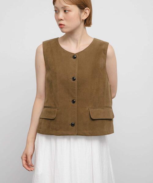【レイヤードスタイルに欠かせないスエードライクなベスト】 トレンドのスエードライクな素材を使用した、レイヤードコーデに欠かせないベスト。コンパクトなサイジングはこなれ感を演出してくれます。シャツやロンTEE、ワンピースに重ねるだけで鮮度UPな着こなしが完成。同素材のパッチポケットテーラードジャケット(KBA7-27R040)や、トラペーズミニスカート(KBA7-25R020)を合わせるとブリティッシュなスタイリングが叶います。 【2025 Autumn/Winter】【25AW】 総重量 : 約220g ※商品画像は、光の当たり具合やパソコンなどの閲覧環境により、実際の色味と異なって見える場合がございます。予めご了承ください。 ※商品の色味の目安は、商品単体の画像をご参照ください。 ▼お気に入り登録のおすすめ▼ お気に入り登録商品は、マイページにて現在の価格情報や在庫状況の確認が可能です。 お買い物リストの管理に是非ご利用下さい。 素材感 透け感 : なし 伸縮性 : ややあり 裏地 : あり 光沢 : なし ポケット : あり one