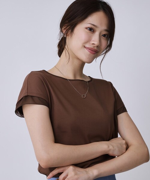 〇デザインポイント 袖口と衿ぐりに異素材を使用したカットソー。 袖口部分をシアーなシフォンにし、軽ろやかでありつつ少し長めのフレンチスリーブに仕上げました。 衿部分も透け感のあるシフォンにすることでデザインポイントに。 〇素材ポイント 身頃は綿100%のキレイ目スムースジャージ。 別布部分は軽さとシアー感のあるシフォンでポリエステル100%です。 〇スタイリングポイント ジャケット合わせやスカート・パンツに単品で合わせても着て頂けるアイテムです。 ジレ(品番187-44922)合わせもおすすめです。 ※照明の関係により、実際よりも色味が違って見える場合があります。また、パソコン・スマートフォンなどの環境により、若干製品と画像のカラーが異なる場合もございます。 モデル情報:身長171cm B77 W62 H86 着用サイズ:38(M) 店舗へのお問い合わせ商品番号:187-13876 ●製品寸法: 34(SS):着丈49cm B88cm 裄丈30cm 36(S):着丈51cm B91cm 裄丈31cm 38(M):着丈52cm B94cm 裄丈32cm 40(L):着丈53cm B97cm 裄丈33cm 備考:
