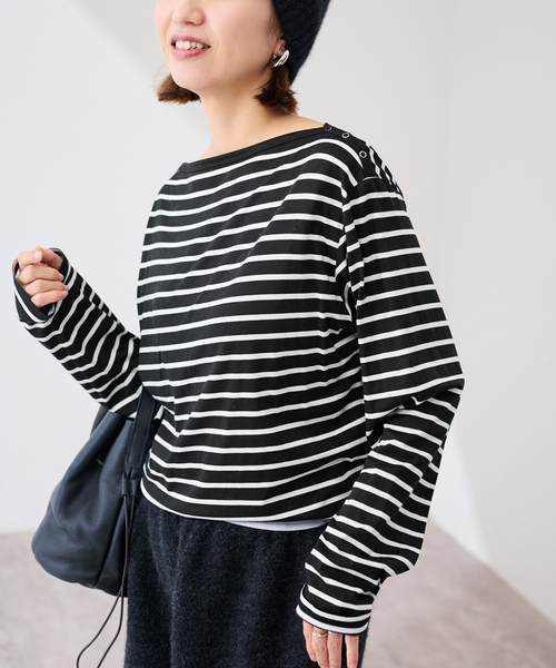 肩のスナップボタンがアクセントになる、ボーダーカットソー。さらりとした肌触りが心地よい、天竺素材を使用。ややゆったりとしたサイズ感で、程よく力の抜けたシルエットを演出。スナップボタンによって襟開きの調節が可能で、大きめに開ければボートネック風にアレンジができ、女性らしいスタイルも楽しめます。**********************透け感:なし裏地:なし伸縮性:あり光沢感:なし生地の厚さ:普通**********************※取り扱いについては、商品についている品質表示でご確認ください。※こちらの商品は、FRAMeWORK での取り扱いになります。直接店舗へお問い合わせの際は FRAMeWORK 店舗へお願い致します。※照明の関係により、実際よりも色味が違って見える場合があります。またパソコン・スマートフォンなどの環境により、若干製品と画像のカラーが異なる場合もございます。予めご了承の上ご注文ください。※商品の色味は、商品アップ画像をご参照ください。本体:手洗い可能