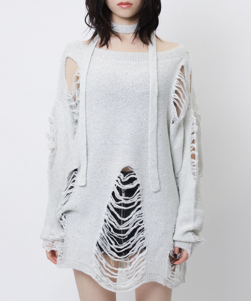 大人気のダメージニットがスパンコールのついた糸になって登場!ダメージ加工をがっつり施したオーバーニットトップス。 ?ダメージがあることでさりげなく肌見せをでき、ルーズさが抜け感を演出してくれます。 スカーフもついているのでシーンに合わせてつけるとトレンドっぽいコーデに◎ スパンコールの糸が華やかにみせてくれるので一枚で主役級に。 スカートやパンツどちらでも合わせられるので着回し抜群◎ 合わせの小物でカジュアルにもセクシーにも韓国っぽくも着こなせます。 ********************** 透け感:あり 裏地:なし 伸縮性:あり 光沢感:なし 生地の厚さ:普通 ********************** ※モニター・環境等により実際の商品と多少色味が異なって表示される場合がございます。? 予めご了承をお願いいたします。 ※サイト上のカラー名と、お届け商品に記載されているカラー名が異なる場合がございます。 ※他のキャンペーンにより、期間中に価格が変動する場合があります。 ※セールは予告なく終了させていただく場合もあります。