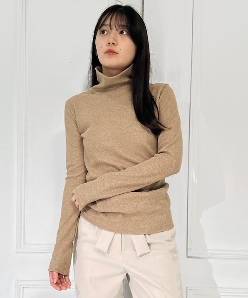 AVIE 205-26 Fall & Winter Collection リバーシブル着用可能 シルバー×オフ ブロンズ×モカ ブラック×ブラック <Material> 綿とポリエステルの糸を使用した、ラメ糸入りのリブ素材。 繊細なラメ糸を織り込むことで、華やかさをさりげなくプラスしながらも、上品な輝きを持たせた仕上がりに。 肌触りはソフトで、チクチクやざらつき感がなく、快適な着用感をキープ。 透け感もないため、単体でも安心して着用できるのがポイント。 リブ組織ならではの適度な伸縮性があり、動きにフィットする柔らかさとフィット感を両立しています。 別布はニットオーガンジー。 オーガンジー特有の繊細な透け感と、トリコットの伸縮性を兼ね備えた素材。 サラリとしたタッチで肌離れが良く、軽やかな質感が特徴です。 編地はしっかりとしており、伝線しにくい構造を採用。 透け感がありながらも程よいハリを持ち、シャープなフォルムをキープできるのもポイントです。 軽やかさと強度を両立したバランスの取れたファブリックです。 <Desgin> シンプルなインナーメインのハイネックは、リバーシブル仕様。 トレンドのシースルーインナーとシンプルなリブハイネックを一枚に融合し、気分やスタイルに合わせた着こなしが可能に。 単体でさらりと着るのはもちろん、レイヤードスタイルにも活躍。 首元にシースルー部分を覗かせたニュアンスのある着こなしや、ラメの入ったリブの質感を効かせたスタイリングなど、幅広いコーディネートにフィットします。 さらに、シースルーだけでは頼りない袖口や裾も、リブとのドッキングで安定感をプラス。 繊細な透け感と程よいフィット感を両立しながら、日常使いしやすい仕上がりになっています。 冬には、この下にさらに暖かい薄手のインナーを重ねると思いますので、透け感は気にならず着用可能です。 下に着用するアイテムによって、ロングシーズン活躍するアイテムです。 #ブラウンカラー #シアー