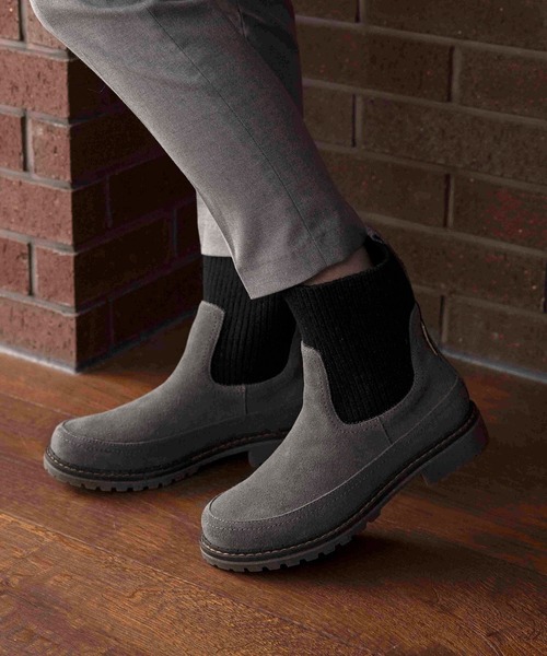 25AW国内限定アイテム 【雨の日もおしゃれに。機能美が光る「ニットソックスサイドゴアブーツ」】 防水×快適×美シルエット 毎日の通勤や休日のお出かけにも頼れる、大人のための晴雨兼用防水サイドゴアブーツ。 アッパー全体に防水加工を施し、防水テープ付きのステッチ構造で雨の日も安心。 撥水性にも優れ、スエード特有のシミを軽減し濡れても目立ちにくいのも嬉しい! 足首をすっきり見せる柔らかなリブニット素材の履き口が暖かく包み込み、足に優しいスクエアトゥが、ストレスフリーな履き心地を実現。 プルストラップ付きのスリッポン設計で、片手でサッと脱ぎ履きが出来、ギザギザのアウトソールで濡れた朝にも安心のグリップ力を発揮! スタイリッシュで上品なデザインは、大人カジュアルやキレイ目コーデとも好相性。 秋冬のコーデが映える深みのあるブラウン・ブラック・グレーの3色展開で、グレーのみカラーが切り替えられたデザインで抜け感をプラス。 季節や天候を問わず履けるので、通勤・通学でもおしゃれを妥協したくない方にぴったりの1足です。