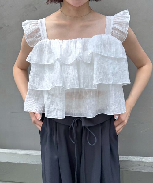 たっぷりフリルが目を惹く♡フリルノースリブラウスが登場!商品コメント・動くたびに揺れる軽やかなデザイン♡・一枚で主役級の存在感!・涼しげなノースリデザインで、夏のお出かけにぴったりのアイテム♪もちろんデイリー使いにも◎スタイリングポイント・デニム合わせで甘辛MIXに!・スカートと合わせてとことんガーリーにも♡・パンツと合わせてカジュアルダウンした着こなしもおすすめです◎※洗濯、取り扱い洗濯:家庭洗濯NGアイロン:低温120℃までタンブル乾燥:不可-----------------------------------------------------裏地:なし伸縮性:あり(胸元ゴム紐)光沢感:なし生地の厚さ:うすめ------------------------------------------------------商品のお気に入り登録➡お気に入りアイテムの値下げ・再入荷・在庫1点などの通知を受け取ることができます。ブランドのお気に入り登録➡ 新商品や再入荷、セール、クーポン配布などお得な情報を受け取ることができます。※サイト上のカラー名と、お届け商品に記載されているカラー名が異なる場合がございます。※商品の色味は、撮影場所や光のあたり具合などにより色味が違って見える場合が御座います。また、お客様のお使いのPCのモニター環境などにより色味が違って見える場合が御座います。予めご了承の上ご注文下さい。※ご注文いただいた予約商品のお届け時期の確認は、注文履歴ページより行えます。------------------------------------------------------