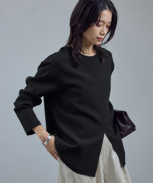 UVカット・防シワ・ストレッチ機能付きで、デイリーからきれいめまで活躍。艶感二重織り素材のレディースブラウス■デザイン / シルエット程よい光沢感を持つ二重織り素材を、Tシャツ感覚で着られるブラウスに仕立てました。ゆったりとしたリラクシーな着心地ながら、シルエットはシックで上品。フロント裾のスリットが抜け感をプラスし、片側インの着こなしも映えます。デニム合わせでカジュアルにも、同素材パンツとのセットアップでフォーマルにも対応可能。季節を問わず着回せる万能アイテムです。■素材光沢感と軽やかさを兼ね備えた二重織り素材を使用。従来よりも軽量化しつつ、安心感のある肉感を保持。UVカット、防シワ、ストレッチ性に加え、自宅で洗えるイージーケア仕様。シーズンレスで活躍する高機能素材です。■コーディネートカジュアルボトムでデイリーに、タックパンツやスカートでオフィスやお呼ばれにもマッチ。同素材のパンツと合わせればセットアップとして、フォーマルシーンにも活用可能。小物やインナー次第で春夏秋冬楽しめます。■セットアップで着用可能な同素材のスラックスもございます。 商品番号:SHS35670商品名:セミフレアスタイルアップパンツ■モデル身長:165cm 着用サイズ:F(ショートヘアモデル)■モデル身長:166cm 着用サイズ:F(ミディアムヘアモデル)-----------------------------裏地:なし光沢感:なし透け感:なし伸縮性:ややあり生地の厚さ:やや薄手-----------------------------