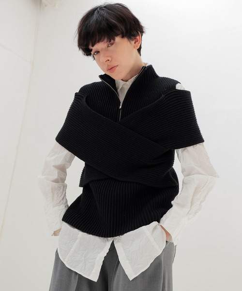 ■DESIGNフロントクロスディテールが特徴的なニットプルオーバー。さりげないスリットスリーブやフロントZIPを開けた着こなしで抜け感を演出。肌寒くなる季節には、シアーインナーとのレイヤードで奥行きのあるスタイルに。パンツにもスカートにもバランス良く合わせやすく、視線をトップに集めてスタイルアップも叶う一枚です。---------------------------透け感:なし裏地:なし伸縮性:ありケア方法:手洗い可※お洗濯の際は洗濯表示を必ずご確認ください。---------------------------