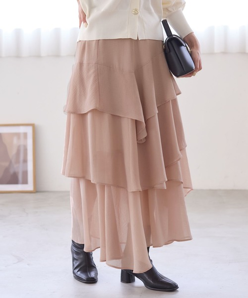 トレンドデザイン。 揺れて可愛いティアードスカート! 華やかな揺れ感を楽しむティアードスカート。◆2025秋冬◆ <POINT> ・ウエストゴムだけど前にはギャザーがなくすっきり。 ・4段ティアード。 ・表面感のある軽やか楊柳素材。 ・オリジナル花柄アソート。 ・裏地付き。 【デザイン・シルエット】 ぐるゴムで履きやすい楊柳ティアードスカート。 ウエストのフロントはギャザーにならないようすっきり見せにしました。豪華に4段ランダムティアードが今期の気分。たっぷりのフレア感はあるのに太って見えないのがポイントです。 【素材】 シアー感のある楊柳素材。 【カラー】 コーラルピンク、チャコール、オリジナル花柄の3色展開。 【おすすめのスタイリング】 1点で主役級のこちらのスカートはまだ暑い時期はコンパクトTシャツや、ノースリのサマーニットカーデトップスなどと合わせるのがおすすめです。秋めいてきた頃は、インナーにキャミ、もしくはロゴTで、羽織にスエードのシャツとの合わせがおすすめ! 【スタッフ着用レビュー】 ・身長153cm 骨格ウェーブ 着用サイズ:F 一枚履くだけでコーディネートが華やかになります! 153センチの低身長さんでも履ける長さですがウエストが大きめなのでベルトがあると安定感が増します。 落ち感がしっかり出るので広がりや着膨れはほとんどなかったです。 ・身長154cm 骨格ストレート 着用サイズ:F シアー感のある素材ですが、裏地がしっかりとあるので、透け感を気にせず着用できます。 フリルの動きがあり、ボリューム感がちょうど良いです。 身長154センチで着用したところ足首にかかるほどの着丈になりました。 ・身長157cm 骨格ストレート 着用サイズ:F ティアードのデザインをしたロングスカートでくるぶし辺りぐらいの長さです。サラッとした素材感に、生地はそこまで分厚くないので今の時期から秋口まで着ることができます。3色とも試しに着用してみましたが、透け感もなく安心して着ることができました。ウエストがゴムなので楽に着れるのでオススメです! ・身長164cm 骨格ウェーブ 着用サイズ:F 身長164cmで足首がしっかり見えるくらいの丈感。 ふわっとしたティアードのデザインなので、骨格ウェーブで腰回り気になる体型ですがしっかり隠してくれました◎。裾部分少し透け感があって、夏はサンダル合わせてヘルシーに、冬はブーツ合わせで着られます。 ・身長165cm 骨格ストレート 着用サイズ:F 165cmで足首より7cmくらい上の丈感でした。ウエストがゴムで楽ちんに着れました◎。 サラッと素材なので今から秋まで長く着れますよ!裾に向かって程よく広がるシルエットで、綺麗見えします。 ----------------------------- 裏地:あり(内側の生地と一体であり) 光沢感:なし 透け感:なし 伸縮性:なし ウエスト:後ろ一部ゴム ファスナー:なし ポケット:なし ボタン:なし 生地の厚さ:薄手 季節:春、夏、秋、冬 ----------------------------- 【モデル着用サイズ】 チャコール・ピンク系着用スタッフ身長:164cm、着用サイズ:F 全色モデル身長:165cm、着用サイズ:F ※画像の商品はサンプルです。実際の商品と仕様、加工、サイズが若干異なる場合がございます。 ※画像によっては実際の色味と異なる場合があります。正しい色味は生地アップ画像をご確認ください。