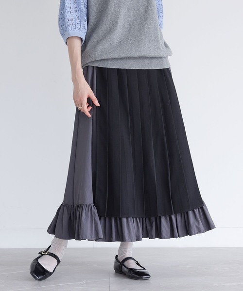 ■デザインツイル生地にプリーツを施し、上品な立体感を演出。両サイドのスリットから覗くナイロン素材のティアード切り替えが、動くたびに軽やかな表情を生み出します。異素材の組み合わせが映える、贅沢な主役級スカートです。■コーディネート休日のお出かけには、リラックス感のあるカジュアルスタイルがおすすめ。存在感のあるスカートには、シンプルなリブタンクやショート丈Tシャツを合わせて軽やかに。足元はバレエシューズで抜け感を出し、キャップやキャンバスバッグでアクティブさをプラス。動くたびに揺れるサイドの切り替えデザインが、ナチュラルなこなれ感を演出してくれます。■素材プリーツ加工をかけたツイル生地とシャカシャカとした風合いとしぼ感のあるナイロン生地を使用。動きに合わせて表情を変える、立体感と軽やかさが魅力の素材感。ウエストはゴム仕様で着脱も楽ちんです。■製品についての注意書きこの製品はプリーツ加工を施していますが永久的なものではなく、着用や水洗い、クリーニングを繰り返す事によりプリーツが消失する恐れがあります。洗濯はネットを使用し、脱水は短時間で処理し直ちに干してください。ご了承の上、ご購入いただきますようお願いいたします。