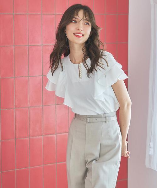 【猛暑を賢く品良く乗り切る、異素材ドッキングフレアスリーブカットソー】【Point】・通気性が良く暑い日でも快適な着心地を期待できる綿80%使用したカットソー。・胸元には存在感のあるパールを連ねて、女性らしく気品ある着こなしに仕立てます。・袖部分には布帛で作るフレアスリーブをドッキングさせることで、オフィスでも着やすいきちんと感をプラス。・流れるように広がるラッフルスリーブが気になる二の腕もされげなくカバーしてくれるので、人目が気になる場所でも一枚で安心して着用いただけます。・洗濯機の使用可能なためデイリーに着用しやすく、イージーケアなところも嬉しいポイントです♪ケア方法:洗濯機の使用可能透け感:なし(オフのみ多少あり)裏地:なし伸縮性:あり光沢感:なし生地の厚さ:中肉F:(00):着丈 52㎝/バスト 92㎝/肩幅 32㎝/袖丈 17㎝/ウエスト幅 45.5㎝/裾幅 49㎝