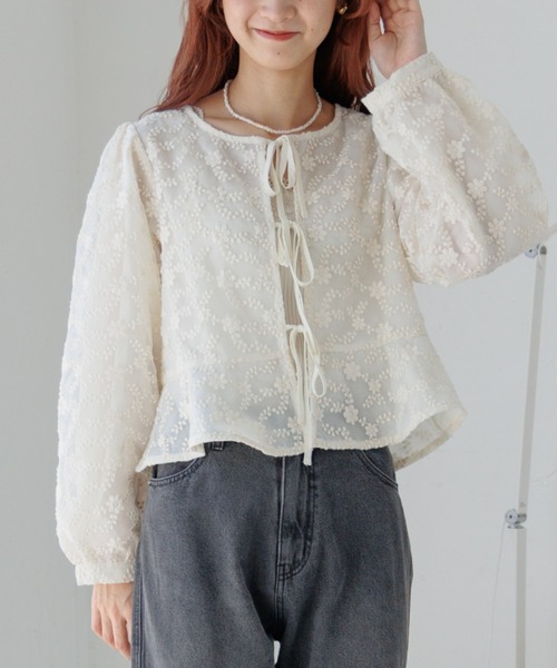 ■デザイン 刺繍が麗しい主役級ブラウス♪ シフォン裏地を重ね、 ほどよい透け感にこだわりました。 フェミニンで透明感のある一枚です。 小さなフリルを裾に施し、 大人の女性らしい落ち着いた印象に仕上げました。 細めのリボンが並んだデザインでトレンド感も◎ 秋口のムードに取り入れやすい 落ち着いた色味をご用意しました。 デイリー使いからデート、イベントまで 幅広いシーンで活躍します。 ■おすすめコーディネート カジュアル素材やシンプルなシルエットの ボトムスとの合わせがおすすめ♪ 気温が高い日のインナーにはgorgeous lace cami2、 肌寒い日にはタートルネックと合わせるなど 様々なスタイリングをお楽しみください♡ ■flower/フラワー 「love&joy」をコンセプトに、商品に愛を込め、 お客様に楽しんでいただけるような、 ナチュラルでガーリーなアイテムを提案していきます。 【お買い物を上手にお楽しみいただくためのPOINT2つ】 ◎ 購入ボタン横の ♡ (ハートマーク)をクリック! 完売カラーの再入荷通知、残り1点の通知、 セールの通知を受け取れます。 (クリックまたはタップで商品のお気に入り登録♪) ◎ ショップのトップページにある ♡ (ハートマーク) 「お気に入りショップに追加」をクリック! 新商品や再入荷等、いち早くブランドの お得な情報を受け取れます。 (ブランドのお気に入り登録♪)