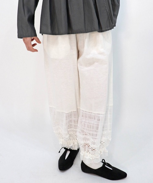 雨粒のように上品で繊細なジャガードチェックレースを使用したパンツ。様々なレースを組み合わせて作った裾フリルがかわいいリラクシーデザイン。ゴムで裾を絞った遊び心のあるシルエットです。ジャガードとレースを組み合わせた膝から下はさりげないレースの透け感があります。ゆったりめのシルエットにウエストはゴム仕様。ストレスフリーで着用できるのも嬉しいポイント。両サイドポケット付きです。1枚での着用はもちろん、チュニックやワンピースと合わせてレーシーな裾を見せるドロワーズコーディネートもおすすめです。膝から上はコットンリネンを使用しています。洗いざらしたようなナチュラルなシボ感とやわらかさが特徴です。やや薄手ながらしっかりとした生地感で、サラッとした風合いです。同素材を使用したスカート、ワンピース展開もあります。ワンピースとパンツをセットで着るスタイルもおすすめです。#レーヤード #重ね着 #大人カジュアル #ガーリー ◇洗濯:手洗い可◇裏地:裏地ナシ【商品に関するご注意】※取り扱いについては、商品についている品質表示でご確認ください。※商品画像はサンプルのため、色味や仕様、サイズ感など変更がある場合がございますので予めご了承ください。※プリント生地の商品については、生地の裁断・縫製方法により写真と同様の柄が出ない場合がございます。※照明の関係により、実際よりもやや明るく見える場合がございます。また,お使い のパソコンのモニター環境によって、実際の商品と画像のカラーが多少異なる場合もございます。予めご了承ください。※サイズ表記は、2cm程度(ニットの場合は2~4cm程度)の誤差が生じる場合がございます。上記予めご了承いただけますようお願いいたします。【 Information 】■商品のお気に入り登録完売していても再入荷時に再入荷通知を受け取ることができますので、是非ご登録ください♪■ブランドのお気に入り登録新商品や再入荷などの情報を受け取ることができますので、是非ご登録ください♪