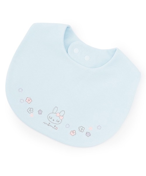 mimiちゃんと小花の軽いタッチの刺しゅうが入ったスムース地のスタイです。首周りの微調整ができるようスナップが2つ付いています。シンプルな無地ベースなので、お手持ちのウェアにも合わせやすく、自家用にも、プチギフトにもおすすめのアイテムです。