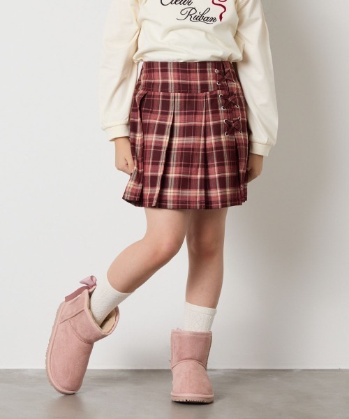 ◆通学にも便利!編み上げとプリーツの組み合わせががかわいい!◆【デザイン】・プリーツとレースアップの旬なデザインが取り入れられた、スタイリングにトレンド感を出してくれるスカート。 ・人気のレースアップデザイン♪ ・通学服もこだわりたいおしゃれキッズにおすすめ。 ・レースアップがコーデのアクセントに。いつものコーデをおしゃれに格上げ! ・レースアップ部分は共布仕様にすることで、コーデの邪魔にならず上品な印象に。 ・カジュアルからきれいめまで幅広いスタイリングに活躍するシンプルなシルエット。 ・通学、お出かけなどシーンに合わせて選べる、チェック柄・デニム・無地クロの4色展開。 ・両サイドにポケットが付いているので通学にも便利。 ・後ろゴム仕様で、子どもでも着脱楽ちん。 ・フロントにはゴムが入っていないので、ウエスト周りすっきり見え。【素材】・チェックやデニム等、色によって異なる布帛素材。【スタイリング】・フロント部分がすっきりしているのでトップスインがおすすめ。 ・ゆるっとしたトップスをアウトして裾からスカートを覗かせてもかわいいスタイリングに。 ・コンパクトなトップスを合わせてフレアなシルエットを際立だせると◎ ・通園通学、アクティブシーンに、ガーリーからカジュアルまで幅広いコーディネートを楽しめる万能アイテム。 ・デザイントップスと合わせてお出かけスタイルに。 ・トレンドのオーバーサイズトップスと合わせれば、いまどきの姉っぽゆるスタイルが即完成! ・タイツや、ハイソックス、ブーツやスニーカーなどで足元のおしゃれを楽しむのもおすすめ。【カラー】・ピンク(チェック柄)…茶色とピンクの組み合わせが秋らしいチェック柄 ・ブルー(デニム)…着回し力バツグン!なブルーデニム ・グレー(デニム)…ブリーチ感がおしゃれでお姉さんっぽい雰囲気。 ・ブラック(無地)…綺麗めからカジュアルまで。様々なコーデに使いやすいベーシックなカラー。----------------透け感:なし裏地:なし伸縮性:なし光沢感:なし生地の厚さ:普通----------------≪お気に入り登録機能の使い方≫■商品のお気に入り登録(ハートマークをクリック)再入荷通知や値下げ等、お得なご案内を受けることができます。 ※WEB・一部店舗限定販売です。----------------※サンプルでの撮影となるため、実際にお届けする商品と仕様やサイズが異なる場合がございます。※商品画像は、光の当たり具合やパソコンなどの閲覧環境により実際の色味と異なって見える場合がございます。 商品の色味の目安は商品単体の画像をご参照ください。