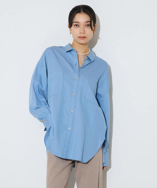 Liesseで人気の定番のシャツです。 程よいオーバー感に後ろ見頃にはギャザー仕様になっており、固すぎず女性らしい抜け感のあるシルエットに仕上がっています。 上のボタンをはずし、抜け感を出した着こなしはもちろん、インナーにも着やすいサイズ感に仕上がっております。 毛羽立ちが少ないコットンコンパクトヤーンとサスティナブルなリサイクル糸で織られた環境配慮素材です。 ドレープ感のあるソフトな風合いのきれめなテンセル混デニム素材です。