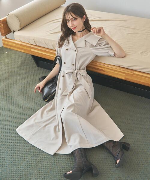 【きちんと感と柔らかなフェミニンさを兼ね備えた、都会的クラシカルに映えるトレンチディテールワンピース】 【Point】 ・トレンチコートのディテールを取り入れた、都会的クラシカルな表情のワンピース。 ・小顔効果も期待できる印象的なビッグカラーが程良いトレンド感を演出します。 ・ダブルボタンと共布リボンがウエストをすっきりと引き締め、女性らしく美しいフィット&フレアシルエットを構築します。 ・ふんわりとしたハーフスリーブが女性らしい柔らかさをプラス。 ・ご自宅でのお手入れ可能な、イージーケアなところも嬉しいポイントです。 ケア方法:手洗い可能 透け感:なし 裏地:なし 伸縮性:なし 光沢感:なし 生地の厚さ:中肉 F:(00):着丈 125.5㎝/肩幅 31㎝/バスト 92㎝/ウエスト 71㎝/袖丈 38㎝/袖口 29.5㎝/裾回り 197.5㎝