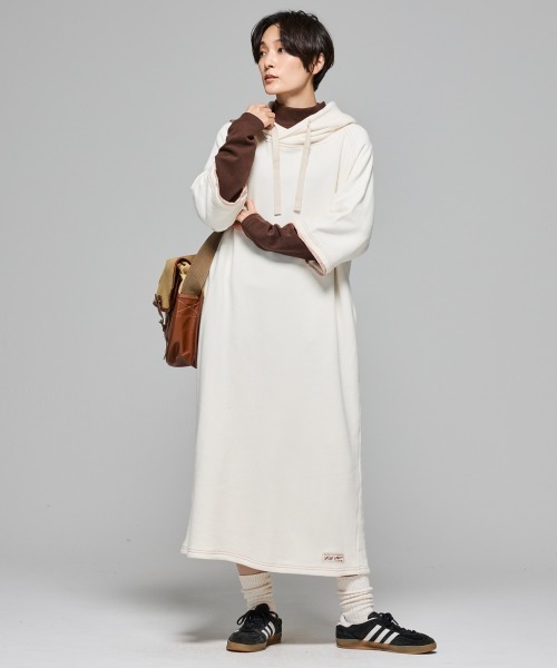 《KRIFF MAYER 秋冬アイテム「ざっくり裏毛7分袖ワンピース」》太番手の糸とざっくりとしたオリジナルスウェット素材を使用したワンピースです! ゆったり楽に着られるサイズ感で、配色のステッチと切りっぱなしの仕様がポイント♪ フード部分は重なりを多くしているので、ボリュームネックのように着られる一枚です。 七分袖にしているので、Tシャツなどとレイヤードしてコーディネートを楽しめます◎-------------------------シルエット:ややワイド生地の厚さ:普通透け感:ややあり(ナチュラル部分のみ)伸縮性:あり裏地:なしケア方法:洗濯機洗い可(ネット使用)-------------------------●KRIFF MAYER(クリフメイヤー)家族みんなの毎日に楽しさと笑顔をお届けしたい。クリフメイヤーの服にはそんな思いがたくさん詰め込まれています。メンズ・レディース・キッズ、更にドッグウェアまで展開。何気ない日々が特別な思い出に変わる瞬間を演出する、ベーシックかつオリジナリティーあふれる新しいデイリーウエアを提案します。