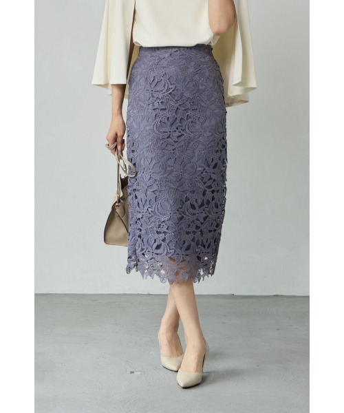 贅沢にあしらわれた立体感のあるケミカルレースが、華やかで凛とした品格を添えるタイトスカート。膝下までしっかりと裏地を配しているので、透けすぎることなく上品にな印象を与え、裾のみにレースの軽やかさを残すことで、女性らしさを引き立て抜け感を演出してくれます。ウエストにはダーツを施し、自然と身体に沿うシルエットで締めつけすぎず、すっと縦に落ちるようなラインが、女性らしさを引き立ててくれます。日常使いにも取り入れやすく実用性とデザイン性を両立し、シンプルなトップスを合わせるだけで絵になる、存在感のある一枚。■素材上品なケミカルレースを使用し、繊細な華やかさを演出。裏地にはストレッチ性のある柔らかな生地を使用し、快適な履き心地に仕上げました。シワになりにくく、お手入れも簡単です。【透け感】なし【生地の厚さ】普通【伸縮性】内側のみあり