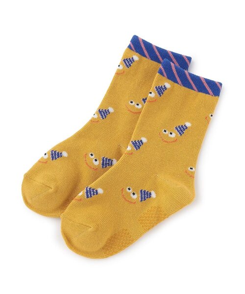 ユニークな顔の総柄が個性あふれるクルーソックスです。はき口は配色のおしゃれなストライプデザインで、アクセントをプラス。肌当たりがやさしく、ストレスフリーなはき心地を実現します。(品番:5353219)とお揃いの企画アイテムです。口ゴム裏にお名前を記入できるスペースがついています。