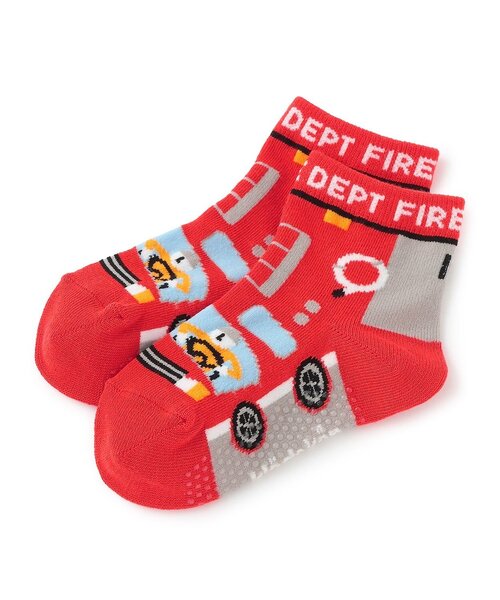 働く乗り物が大集合した4種類のデザインから選べるショートソックスです。赤は消防車、黄とエメラルドグリーンは特急電車、黒はパトカーとそれぞれにワクワクするモチーフをデザイン。今回の乗組員は【人】となっており、いろんな職業に変身した楽しい仕様です。口ゴムの内側にはお名前記入スペースがついています。