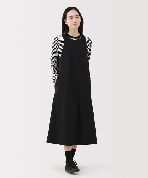 洗濯後シワが目立ちにくく、乾きやすい綿混素材を使いました。綿はオーガニックコットンです。【素材】適度にハリ感のある生地で、洗濯後シワが目立ちにくく、乾きやすい綿混素材です。【デザイン】Aラインシルエットのスリーブレスワンピースです。インナーにTシャツなどを合わせやすいよう、前はボートネック、後ろはVネックになっています。一枚でも着用でき、幅広く活躍するワンピースです。【仕様】透け感:なし伸縮性:なしフィット感:普通【こちらもおすすめ】同素材の「五分袖ブラウス」もおすすめです。お取扱い上のご注意 : ●濃色製品は使用中の摩擦や濡れた状態での接触により色移りする事があります。洗濯の際は他のものと分けて洗ってください。お洗濯上のご注意 : ●淡色製品には蛍光増白剤入り洗剤を使用しないでください。お洗濯上のご注意2 : ●洗濯の際は裏返しにし、洗濯ネットを使用してください。お洗濯上のご注意3 : ●洗濯の際はファスナーを閉め洗濯ネットをご使用ください。お洗濯上のご注意4 : ●アイロンはあて布を使用してください。
