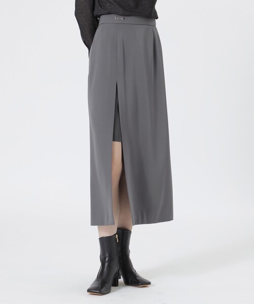 異素材を組み合わせたレイヤードデザインのスカート 【素材】 外側は微光沢のあるサテン素材で、柔らかく膨らみのある風合いが特徴です。 内側は軽量なバックサテンジョーゼットを使用。タテヨコに伸びる2WAYストレッチの素材なので着心地も良好です。 【シルエット/デザイン】 膝丈ミニとロングスカートを重ねたような異素材レイヤードデザイン。 フロントに深く入ったスリットと、ウエストのビットディテールがラップ風に見える構築的なアクセントに。 シャープなAラインシルエットが、モードな雰囲気を引き立てます。 【スタイリング/その他】 コンパクトなシャツやトップスインして、スカートのレイヤードデザインを引き立てるのがおすすめ。 足元はヒールを合わせることで、スリットの抜け感を引き立てつつ、エッジの効いたモードなスタイルに仕上がります。 【お手入れ方法】 こちらの商品は、手洗いでのお洗濯が可能です。 ━━━━━━━━━━━━━━━━━━━━━━━━━━ お買い物をお楽しみ頂くために <商品のお気に入り登録> 完売カラーの再入荷通知など、お得な情報をお届けします。 <注意事項> この商品はサンプルでの撮影を行っています。 実際の商品とイメージが異なる場合がございます。 撮影環境により、光の当たり具合で色味が違って見える場合があります。あらかじめご了承下さい。