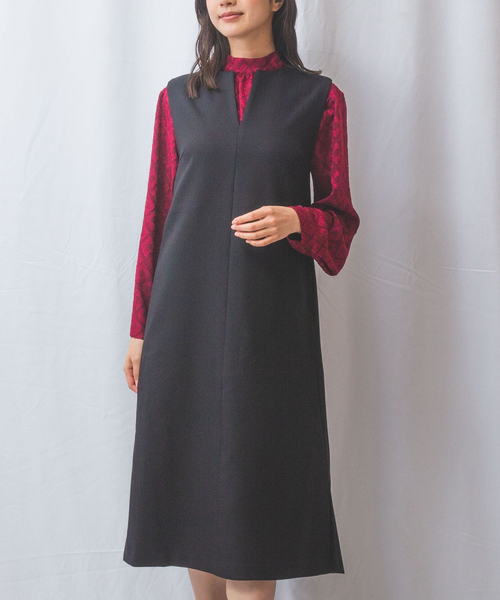 表情のあるメランジ調なヘリンボーンで仕立てられたジャンパースカート。シャープに開いたネックスリットも抜け感のある印象をプラス。Iラインシルエットですらりとした美しい立ち姿を演出してくれます。グログランリボンをあしらったバックネックのファスナーもポイント。合わせるインナーによってロングシーズン活躍してくれるアイテムです。・カラー展開はブラック、ブラウン・サイズ展開は1(M)9号・3(2L)13号