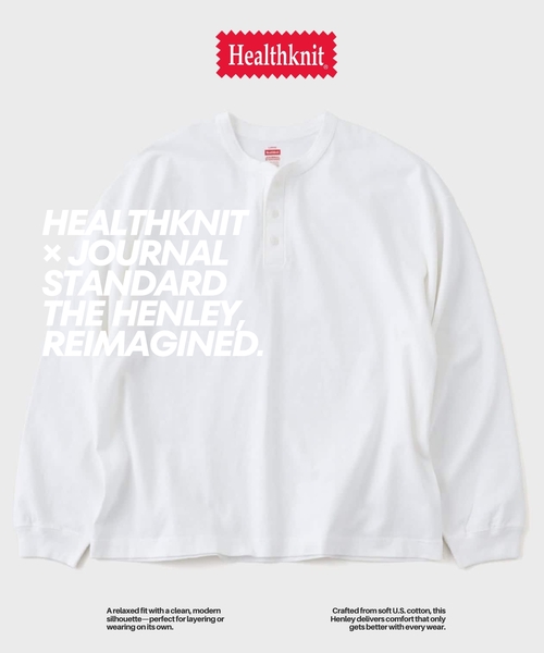 Healthknit × JOURNAL STANDATD ヘルスニット代名詞でもある、ヘンリーネックTシャツの別注モデル。 サイズバランスを見直し、程よくゆったりとした身幅にすっきりとした丈に。 一枚着としてリラックス感のあるサイズで着こなせます。 首元のデザインがある事で、いつもと違う鮮度のある着こなしが可能なおすすめのアイテムです。 ■素材 選び抜かれたU.S.コットン(米綿)を使用し、肌離れの良いドライな着心地を実現しています。 Open-End Yarn(空紡糸)と呼ばれる、空気を利用し遠心力で紡績を行う糸を使用しており、繊維の間に空気を含むため、ふっくら感があり、ドライでざっくりした少し硬めの風合いになるのが特徴です。 着用を重ねるごとに体に馴染み、独特の風合いを増していきます。また、筒状に生地を編み上げる「丸胴編み」を採用。縫い目が肌に触れないため、ストレスのない快適な着心地が得られるというメリットがあります。 【Healthknit / ヘルスニット】 1900年アメリカ・テネシー州ノックスヴィルで高品質なアンダーニットウェアメーカーとして誕生しました。 世界的に有名なアメリカ南部の上質な原料から紡績、ソーイングまで一貫した生産管理の下で製作され、代表的なアイテムである3つボタンのヘンリーネックTシャツは、アメリカが作ったベーシックアンダーウェアのプロト的存在とも言われています。 抜群の着心地の良さから世界中の人々から愛される老舗ブランドです。 ※取り扱いについては、商品についている取扱表示にてご確認下さい。 ※照明の関係により、実際よりも色味が違って見える場合があります。 ※またパソコン・スマートフォンなどの環境により、若干製品と画像のカラーが異なる場合もございます。 ※商品の色味は、商品アップ画像をご参照ください。 本体:洗濯機洗い(弱)