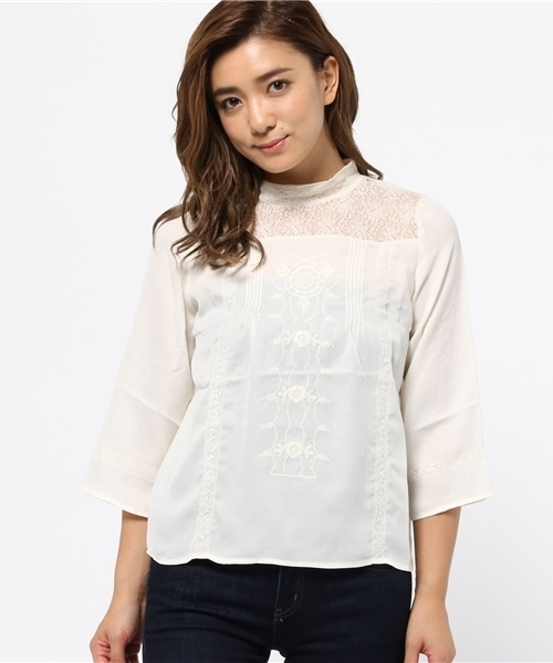 who's who Chico(フーズフーチコ)レース切り替えのヨークで透け感をもたせ、刺繍やピンタックでクラシカル印象のブラウスです。程よくゆとりのあるシルエットがリラックス感をプラス。ボトムスのアレンジでカジュアルにもフェミニンにも表情を変える、女性らしいアイテムです。