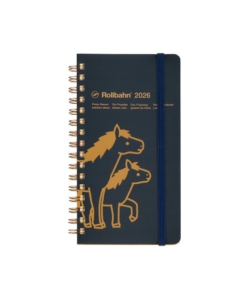 【スリムサイズ】2026年の干支を描いたロルバーンダイアリー(2026年版/2025年10月始まり手帳) 2026年の干支、「午(うま)」を表すウマをモチーフにしたロルバーンダイアリー。 おめでたいことや祝い事と連想される縁起の良い動物で、幸運を運ぶ象徴とされているウマ。親子が仲良く寄り添う様子を描いた、あたたかみのあるデザインです。 タイプ :マンスリー サイズ :スリム 素材 :紙 生産国 :日本 サイズ詳細 :横98×縦166×厚み17mm 仕様 :メモ(125ページ)/5mm方眼/切り離しミシン目付き/PPポケット5枚付き 対応月 :2025年10月~2026年12月 干支のモチーフは、毎年ダイアリーで登場している人気のシリーズです。クリーム、ライトイエロー、ライトピンク、ライトブルー、グリーン、ブラックの全6色。ロゴは、クリームがグレー、ライトイエローがブラック、ライトピンクとブラックがゴールド箔、ライトブルーがホワイト、グリーンがイエローです。リングの色は、クリームとライトピンクがブラック、ライトイエローがブルー、ライトブルーがピンク、グリーンがシルバー、ブラックがゴールドです。リングとロゴの色合わせやイラストの配色にこだわって仕上げました。 縦長フォルムで、片手でも持ちやすいスリムサイズ。中面は、見開きの月間カレンダーとメモページで構成された、シンプルなマンスリータイプ。表紙は透明フィルム加工が施されているため、1年間しっかり使えます。表紙を開くと、中扉、イヤーカレンダー、イヤースケジュール、マンスリー、方眼メモページ、クリアポケットが続きます。5mm方眼のメモページは、書き込みの多い方にも嬉しい125ページ。インクのにじみと裏写りを抑えたクリーム色の上質紙です。カードや付箋などを収納できる、便利なクリアポケットも5枚付いています。表紙には透明フィルム加工が施されているため、1年間しっかりと使えます。同デザインは、ほかに、リングタイプのM、L、A5、横型、ログチャート、ガントチャート、ホチキス綴じのノートタイプのA6、B6、A5、デルフォニックスダイアリーもあります。2026年らしい一冊をお探しの方におすすめです。