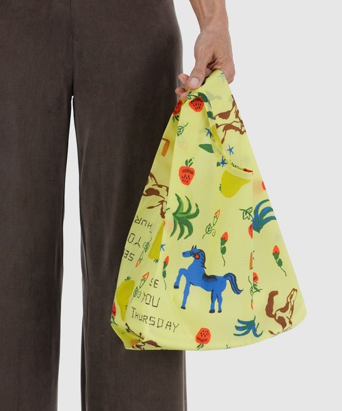 アメリカのバッグブランド「バグゥ」のエコバッグ。スタンダードサイズと比べ、小ぶりでかわいいベビーサイズです。ちょっとした買い物やランチバッグなどに使いやすい大きさです。素材は、パラシュートやテントなどに使用される軽量で耐久性の高いリップストップナイロンを使用しています。付属のポーチに収納すればコンパクトに持ち歩けます。 -100%Recycled!!- 2022年SSシーズンから、従来のリサイクル率40%のリップストップナイロンから、100%リサイクルへアップデート。 【BAGGU】 BAGGU「バグゥ」(日本語の""バッグ""から)は、2007年、カリフォルニアで生まれたバッグブランドです。CEO/デザイナーのEmily Sugiharaと彼女の母Joanが、自分たちが使うために作ったエコバッグ。誰もが手にしたことのあるスーパーのレジ袋を原型に、シンプルでカラフルなナイロン製のエコバッグをデザインしたことから始まりました。