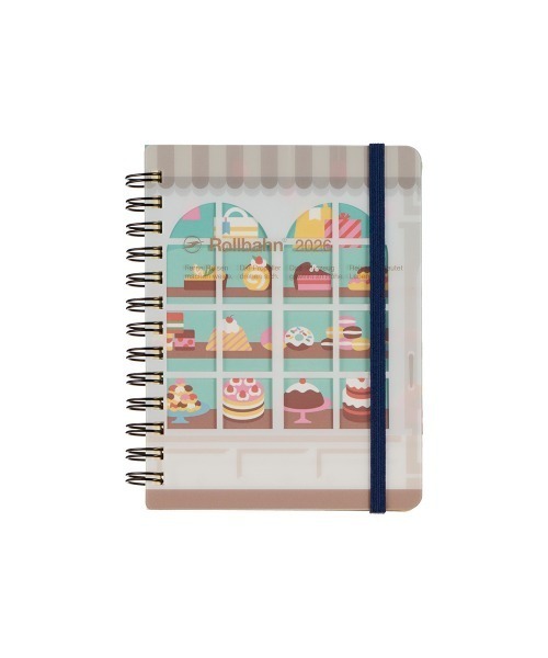 【Mサイズ】二枚重ねの透明表紙で、絵本をめくるような仕掛けが楽しいロルバーン (2026年版/2025年10月始まり手帳) 絵本のページをめくるようなワクワクする気持ちを思い起こす、透明表紙のギミックが楽しい「カシェ」シリーズのロルバーンダイアリー。 お店の入り口のイラストを配したクリア素材の表紙を1枚めくると、店内の様子が広がる仕掛けになっています。 タイプ :マンスリー サイズ :M 素材 :紙、PVC(塩ビ) 生産国 :日本 サイズ詳細 :横113×縦139×厚み17mm 仕様 :メモ(125ページ)/5mm方眼/切り離しミシン目付き/PPポケット5枚付き 対応月 :2025年10月~2026年12月 甘すぎないトーンでケーキとお菓子を描いたホワイト(A<ケーキショップ>)、ベーシックな原色で本や雑貨、文房具を描いたグリーン(B<ブックストア>)の全2柄。(B<ブックストア>)はよく見ると、ロルバーン ポケット付メモも陳列されています。ロゴは、ホワイト(A<ケーキショップ>)がブラウン、グリーン(B<ブックストア>)がホワイトです。海外の絵本をイメージしたイラストで、お店の中に足を踏み入れたような高揚感が広がる仕上がりです。 サイズはコンパクトなメモダイアリーとして最適なM。中面は、見開きの月間カレンダーとメモページで構成された、シンプルなマンスリータイプ。表紙を開くと、中扉、イヤーカレンダー、イヤースケジュール、マンスリー、方眼メモページ、クリアポケットが続きます。5mm方眼のメモページは、書き込みの多い方にも嬉しい125ページ。インクのにじみと裏写りを抑えた、クリーム色の上質紙です。カードや付箋などを収納できる、便利なクリアポケットも5枚付いています。表紙には透明フィルム加工が施されているため、1年間しっかりと使えます。同デザインは、ほかに、一回り大きなLサイズもあります。ユニークなデザインながら、大人にも相応しい一冊です。
