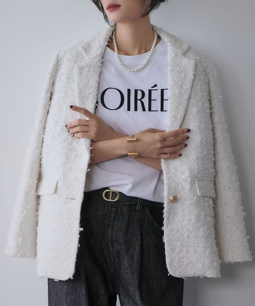 ツイード素材のテーラードジャケットになります。フラップポケットに金釦が効いててポイントになります。軽く羽織ってもきちんと着用してもOK!素材高級感のあるネップの入ったツイード素材になります。動きのあるネップがふんわりとした雰囲気を醸し出します。詳細情報厚み:□薄手 □普通 ■厚手透け感:■なし □あり光沢感:■なし □あり伸縮性:■なし □あり裏地:□なし ■ありカラー展開ブラック(黒)、オフホワイト(白)インフォメーション 【商品のお気に入り登録】再入荷通知やラスト1点の通知、セール情報を受け取ることができます。【ショップのお気に入り登録】新商品や再入荷、お得な情報などを受け取ることができます。ELFRANKELFRANK(エルフランク)は、「Elegant(上品・優雅)」×「Frank(気さくな・身近な)」をキーワードに、ライフスタイルに寄り添った新しいカジュアルスタイルを発信するブランドです。日常のディテールにこだわり、自分らしさを楽しみ磨き上げていく...そんな女性に向けて、等身大の美しさと憧れを表現したファッションアイテムを提案します。※商品画像は撮影時の光や角度、お使いのモニター環境により実物の色味と異なって見える場合がございます。※記載のサイズは実寸サイズとなります。採寸箇所により、差が生じる場合がございます。※通販の特性上、発送上の状態によって商品にシワがついている場合がございます。※着用、お取り扱いの際は、商品に付いている品質表示とアテンションタグを必ずご確認ください。