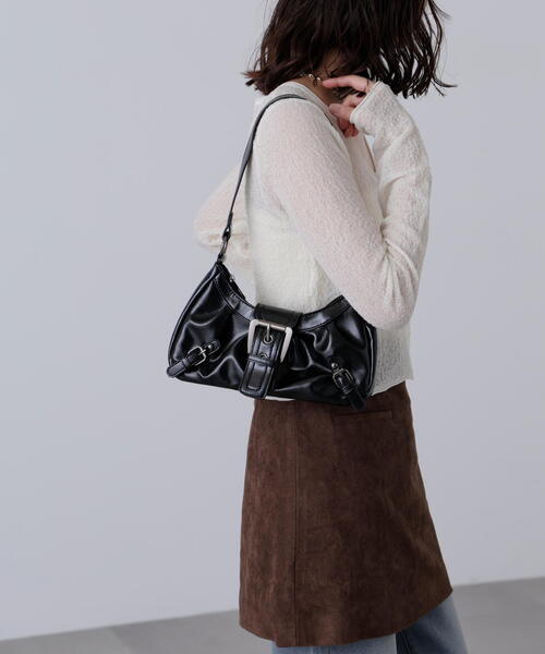 存在感のあるセンターバックルがポイントのショルダーバッグ。すっきりしたカーブフォルムが幅広いコーディネートに合わせやすいデザインです。見た目以上に収納力があり、普段使いからちょっとしたお出かけスタイルまで幅広く活躍します。 ※モデルの着用画像の場合、光の当たり具合により、実際の色味と異なって見えることがございます。色味は、商品単体の画像をご参照ください。