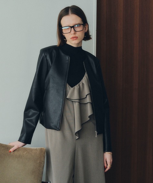コンパクトなシルエットのノーカラージャケット。マットな艶感の合皮素材とメタルパーツの組み合わせがライダース風のデザインを演出します。袖口に施したマチ付きファスナーでシルエットの調整も可能。クールなスタイルからきれいめまで、幅広いコーディネートに取り入れられる着回し力抜群のアイテムです。透け感[なし]生地の厚さ[普通]光沢感[あり]伸縮性[なし]裏地[あり]ポケット[あり]-------------------------------------------●YECCA VECCA●(イェッカ ヴェッカ)「大人のハッピーモードな着映え服」毎日を自分らしく、ハッピーに過ごすことにポジティブな女性のためのリアルクローズ。キーワードは「遊び心のある、女性らしいモード服」でも「コンフォート」。都会的で女性らしいムードを大切に着ていて心地よく、気持ちが上向きになるような遊び心のあるデザインウェアをラインナップ。自分自身がわくわく出来る洋服で日常を最大限に楽しむ大人の為のスタイルを提案していきます。▼商品のお気に入り登録がおすすめです ▼商品ページ内のハートマークをクリック。完売時の再入荷や、最後の1点の通知、最後の1点など、お得なお値下げ情報を受けとる事ができます。【お知らせ】ページでも通知が確認できます。-------------------------------------------
