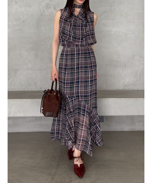 【シアーなのに先取り感のある素材で、秋の装いをいち早く。アシメに揺れる裾がリッチなナロースカート】【Design/Styling】軽くシアーな仕上がりで、動くたびにきれいに揺れる素材感が新鮮な、ナロースカートです。斜めの切り替えが入って、裾に向かってフレアになっているのもポイント。裾丈はランダムになっていて、裾スリットも入っているので抜け感があり、動くたびに揺れて印象に残る一枚です。脚をちらりと見せることもでき、ブーツやタイツも映えます。同素材の、ドレープネックノースリーブチェックブラウス(FWFB254169)とのセットアップでワンピース見えする着こなしもおすすめです。カラーは3色をご用意。カラーで素材が異なります。BEG、NVYは、今年らしいチェック。ライトな素材でもカラーが秋らしいので、先取り感を楽しめます。生地はバイヤスに取り、斜めの柄になっているのが新鮮です。BLKは、透け感のあるカットジャガードを使用。エレガントさもあり、モードな雰囲気で着こなせます。※照明の関係により、実際よりも色味が違って見える場合があります。またパソコン・スマートフォンなどの環境により、若干製品と画像のカラーが異なる場合もございます。予めご了承ください。商品の色味は、商品単品画像をご参照下さい。※商品画像はサンプルのため、色味やサイズ等の仕様に変更がある場合がございますので、予めご了承ください。
