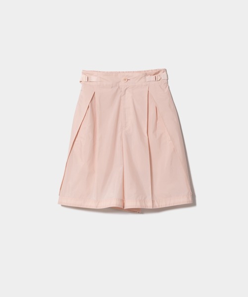 【デザインの特徴】・男女問わずに履ける3タックワイドショーツ・ゆったりとしたワイドシルエット・前中心は通常の縦地の目裁断、後中心に向かってバイアス裁断になるユニークな構造・生地の分量をタックで分散することですっきりとした履き心地の良いウエスト・ウエスト両脇に同色塗装のアジャスターベルト付き・フロントファスナー開き・膝上丈【素材のこだわり】・先染めの光沢感が際立つコットンナイロンのタフタ素材・高密度に織ったハリ感が特徴・弱撥水加工を付与・着用とクリーニングにより徐々に撥水効果は軽減します