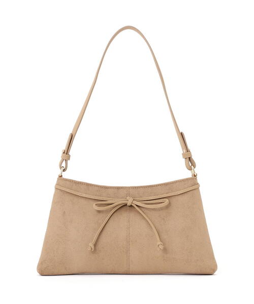 秋冬シーズンに合うフェイクスウェードを使用したバッグ。すっきりとしたボディにリボンディテールが可愛らしいアクセントになります。口元はファスナー開閉で中身をしっかりカバーします。ワンショルダーなので小脇におさまりやすいデザインです。 ※モデルの着用画像の場合、光の当たり具合により、実際の色味と異なって見えることがございます。色味は、商品単体の画像をご参照ください。