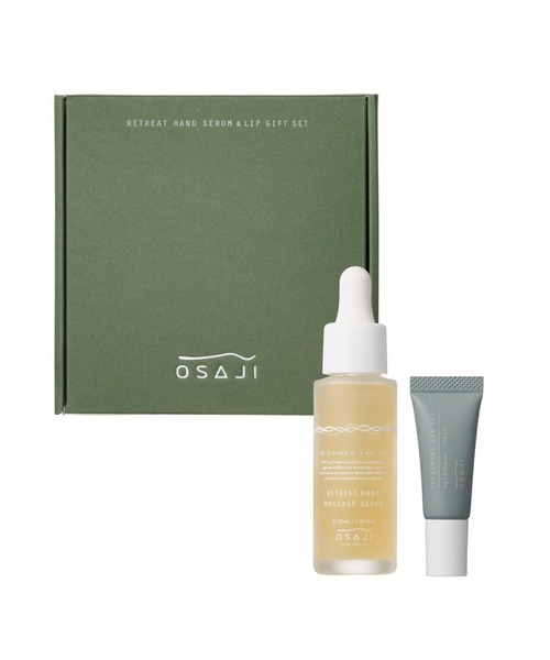 手と唇にうるおいをチャージする、人気のハンド美容液とリップジェルのギフトセット。 フェイシャルと同様に荒れがちな手肌をいたわり、デイリーな集中ケアができるハンド美容液。 ぷるんとしたジェル状テクスチャで唇に水分補給をする、デイリーにお使いいただけるリップジェル。 プレゼントにおすすめのセットアイテムです。 セット内容 ・リトリート ハンド セラム ・トリートメント リップジェル ※ギフトボックスに入れてお届けします こんな方におすすめ ・記念日、誕生日、お祝いに ・お世話になった方へ、送別品、感謝の気持ちをギフトに ・日々のセルフケアを楽しんでもらいたいお相手に ●リトリート ハンド セラム POINT ・マッサージして血行促進をするだけでなく、とことん保湿も出来るハンドセラム ・⼿元をきちんといたわり、 寝ている間にスキンケア同様、集中ケアして休ませる時間を作るハンドケア ・手のマッサージでリラックスタイムに ・毎晩つけたくなるような⾹りとストレスのないテクスチャ 香りについて アオモジ、ラベンダー、ゼラニウムの⼼地よくやさしい⾹り ※植物由来原料を使用しているため、製品単位によって色や香りが異なる場合があります。 成分について ・保湿効果を持つ水添レシチン配合・高保湿かつ保湿の持続を支えるヒアルロン酸クロスポリマー配合 ・キメを整える静岡県産⻘みかんエキスを配合 使用方法 ・おやすみ前にスポイトで適量を手に取り、やさしく指先までマッサージしながら伸ばし、馴染ませます。 ・滑りが悪くなったらマッサージ終了の合図です。乾燥を感じる場合や、物⾜りない時は、多めにとりお使いください。 リトリートハンドモイストクリームを重ねて使うと、うるおいを閉じ込める効果が増し、より一層しなやかな手元に仕上がります。 ●トリートメント リップジェル POINT ・外気からの乾燥を防ぎながら、しっかりと水分をチャージ ・保湿力がありつつも、さらりとみずみずしい使い心地 ・美容液のようになめらかなジェルで、デリケートな唇にうるおいを 香りについて Yuzu Mint 柔らかく穏やかな中にほんのり苦味を感じるシトラス調の「ゆず」を基調に、シャープで爽快感のある「ハッカ」重ねた軽やかな香り。 さらに、明るくジューシーな「オレンジ」に甘さの中にスパイシーなアクセントを持つ「フェンネル」が調和し、すっきりとした中に深みを加えています。 リフレッシュしたいときや、心穏やかに過ごしたいひとときにそっと寄り添います。 ※植物由来原料を使用しているため、製品単位によって色や香りが異なる場合があります。 成分について ・吸着型ヒアルロン酸*¹を配合し、油分だけではなく水分をチャージ・キープ ・スクワランが水分蒸散を防ぎ、保湿力をさらにキープ *¹ヒアルロン酸ヒドロキシプロピルトリモニウム 使用方法 キャップをとり適量を出して、直接唇につけてください。または、指先やお手持ちのリップブラシにとってお使いください。 [容量] 30mL/10g