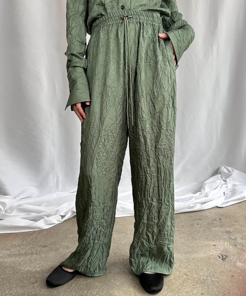 G.V.G.V. (ジーヴィ ジーヴィ)リンクル サテンパンツ【Fabric】シルクのような風合いの生地にシワ加工を施した微光沢素材。綺麗な印象の生地に今季注目のシワ加工を施し一癖あるユニークな生地に仕上げました。接触冷感、吸水速乾の機能性も備わっております。伸縮性なし。透け感なし。加工差が生じる場合があります。ご留意くださいませ。【Design】無駄を削ぎ落とした微光沢パンツ。素材を生かすためデザインはあえてシンプルに、またウエストゴム仕様でリラックスさも追求いたしました。シワ加工なのでアイロンをかける必要がなく、お手入れが簡単なこともポイントです。単品でお使い頂くのは勿論、同素材のシャツと合わせてセットアップで着用して頂くのもおすすめです。サイド2ポケット付き。リラックスサイジング。[SET UP ITEM]GV2531005 WRINKLE SATIN SHIRTG.V.G.V.桑沢デザイン研究所卒。カルチャー、音楽のエッセンスと、時代感を表現するブランドとして1999年にスタート。フェミニンとマスキュリンの同居するオリジナルな世界観と、自由な発想で繰り出すコレクションは、ミュージシャン、アーティスト、ファッション業界などを中心にコアなファンを築いた。ブランドスタートから20年の節目となる2019年より、素材やシルエットへの更なる拘り、ミニマルとエッジの調和の取れたバランスに注力したコレクションを再考。ファッションに夢中になって年を重ねてきた女性たちが楽しめる、大人に向けた服とスタイルを提案している。※照明等の条件により写真と実際の商品とは色味、サイズ等若干異なる場合があります。予めご了承ください。ご利用いただいているモニターの環境によって色が再現できない場合がございます。