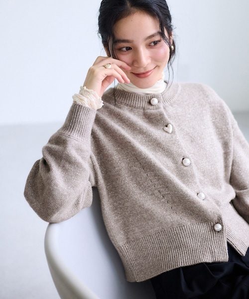 大人気カーディガンに新色のブラウンとレッドが登場! 【2025 Autumn/Winter】【25AW】 <POINT> ・トップス使いができる着回し力抜群のニットカーディガン。 ・パール釦がポイント!第二釦のハート形にキュン。 ・繊細なラメでさりげないキラキラポイントをプラス。 ・ウール混の柔らかな肌触りと表面感で初秋から春先まで長く着られるアイテムです。 ・お手入れが簡単なマシンウォッシャブル。 【デザイン・シルエット】 昨年大好評だったニットカーディガンをアップデート。 着心地のよさ、着まわしやすさ、長く着られるシルエットにこだわっています。トップス使いと羽織り両方に使える着丈でボトムを選ばないサイズ感。袖口のリブでたくし上げられるので抜け感を出すこともできます。フロントはパール調釦で、第二釦はぷっくりハート形に。※ブラック(01),ブルー(44)のボタンは全て丸パール仕様となります。 身頃と袖付け位置にアイレットをデザインし表情を持たせました。 【素材】 ウール混のニットで程よい膨らみがあります。 洗濯機洗い可能。環境に配慮したサスティナブル素材です。 ふわふわの表面感にラメをミックスし、さりげないキラキラもプラス! ・新色ブラウン(22)はラメ糸入り、レッド(60)はラメなし ・ブラック(01)チャコール(06)ブルー(44)は、ラメ糸を使用しておりません。よりベーシックにお召しいただけます ・レッド(60)のみ組成が異なります。ポリエステル 79% ナイロン 17% ポリウレタン 4% 【カラー】 ブラック、チャコール、ライトグレー、ブルー、パープル系(ラベンダー)、ピンク系に新色のブラウン系とレッドを加えた全8色展開。 色展開もたくさんあるのでお気に入りを見つけてぜひ色違いでゲットしていただきたいです! ※ブラック(01):WEB限定カラー、ブルー(44):ルミネ店とWEB限定カラーとなります。 【おすすめのスタイリング】 ボトムを選ばず着まわせるアイテム。 今年はティアードやフリルなどインナーの裾をチラ見せするとワンランク上のスタイリングに。ふわモコ&キラキラでコーデに華やかさが出る、女子の大好きが詰まったカーディガンです。 ----------------------------- 裏地:なし 光沢感:なし 透け感:なし 伸縮性:あり ポケット:なし ボタン:あり(開閉可) 生地の厚さ:やや厚手 その他仕様:ラメ糸が織り込まれている。上から2番目のパールボタンがハート仕様。 季節:春、秋、冬 ----------------------------- 【モデル着用サイズ】 全色モデル身長:168cm、着用サイズ:F ※ブラック(01)は、WEB限定カラーとなります。実店舗での販売はしておりません。 ※ブルー(44)は、公式サイトJ'aDoRe JUN ONLINE含むWEB店舗とルミネ店舗限定のお取り扱いとなります。 ※画像の商品はサンプルです。実際の商品と仕様、加工、サイズが若干異なる場合がございます。 ※画像によっては実際の色味と異なる場合があります。正しい色味は生地アップ画像をご確認ください。