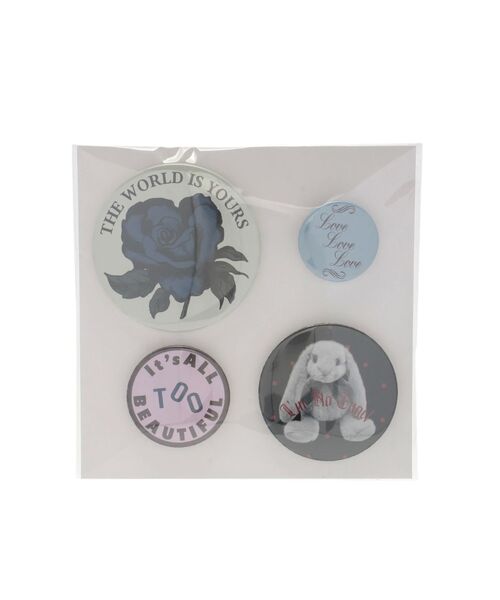jouetie定番のオリジナル缶バッジが今シーズンも登場!! バッグやカーディガン、ジャケットなどアイテムに付けるだけでアクセントになります! セットではもちろん単品でつけたり、お手持ちの缶バッジと組み合わせても♪ ※着用画像はフラッシュの加減で実際の製品と色味等が異なる場合がございます。詳細画像をご参照ください。 ※ご利用の端末画面の設定により実際の商品と色味が異なる場合がございます。 ※正しいサイズはアイテムサイズ表をご確認ください。